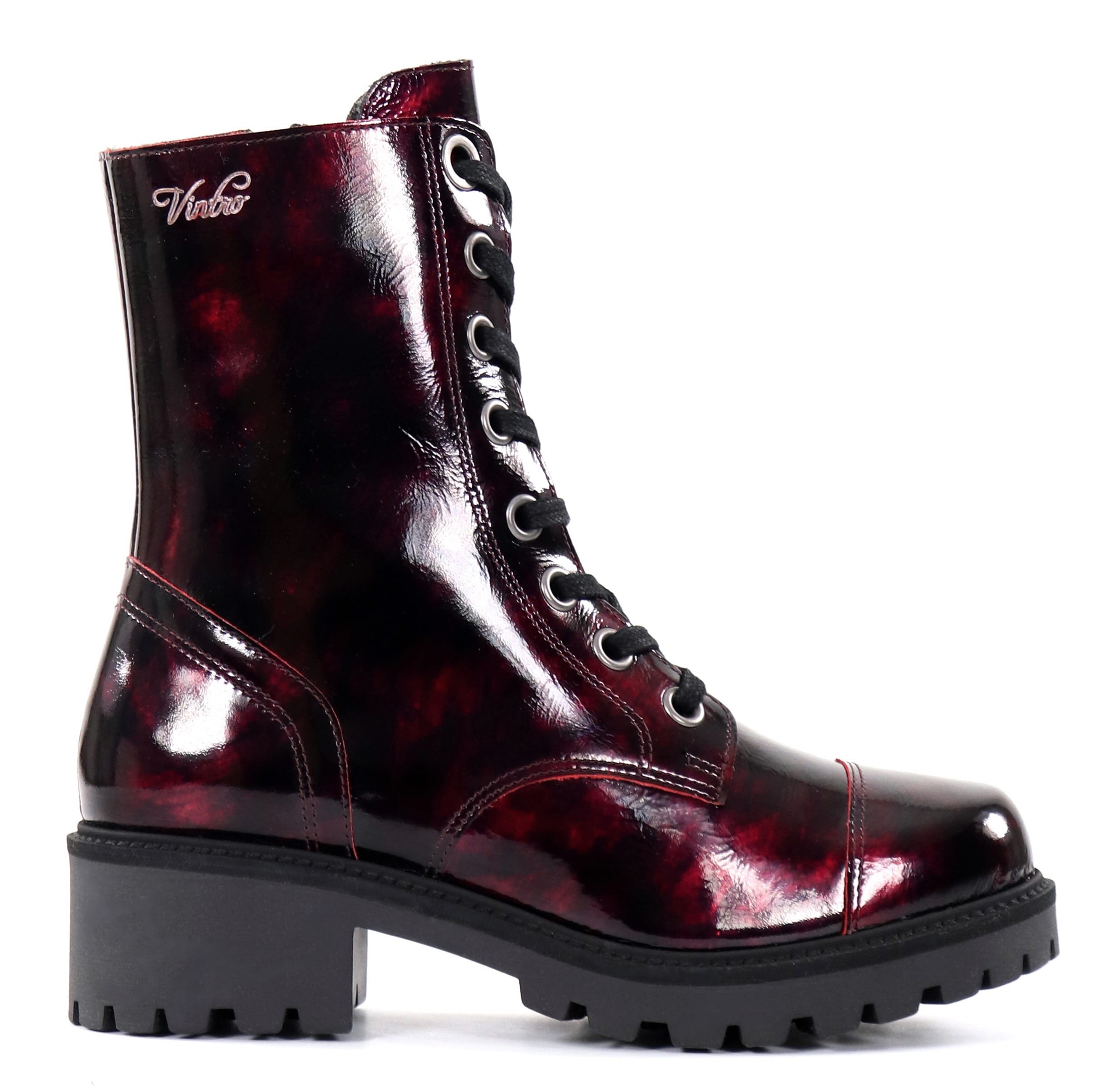 Patent leather ankle boots with a thin wool blend lining and water-resistant treatment.